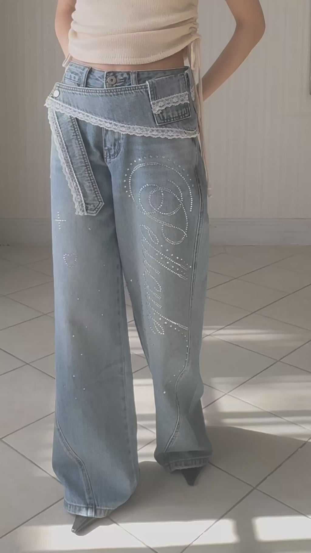ふんたんに散りばめられたラインストーンが存在感を放つワイドシルエットデニム。ウエストのデニムベルトはレースをあしらったカジュアルなアイテムにも程良い甘さを長くせたデザインに仕上げました。