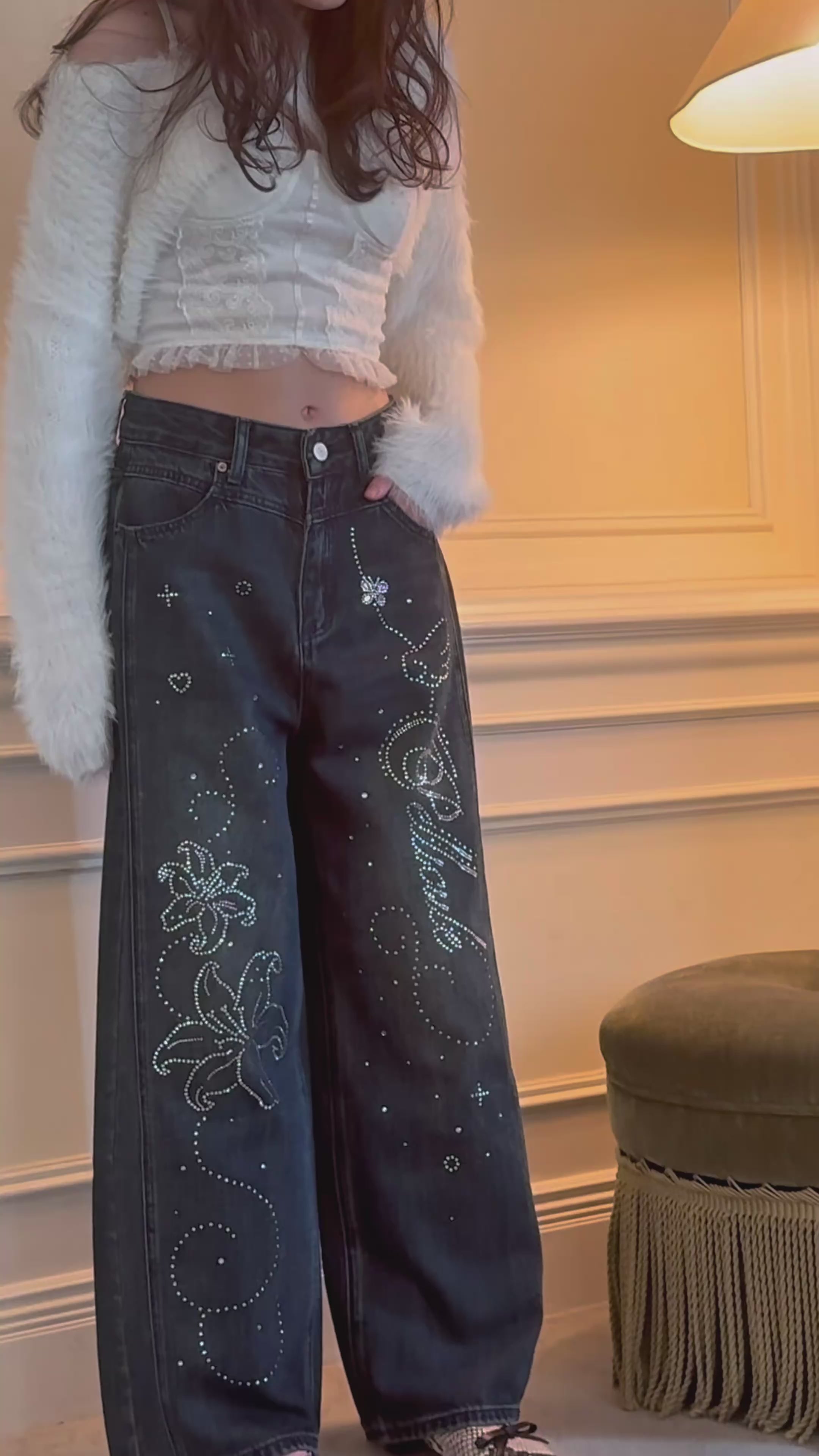 煌びやかなラインストーンが存在感を放つデニムパンツ
