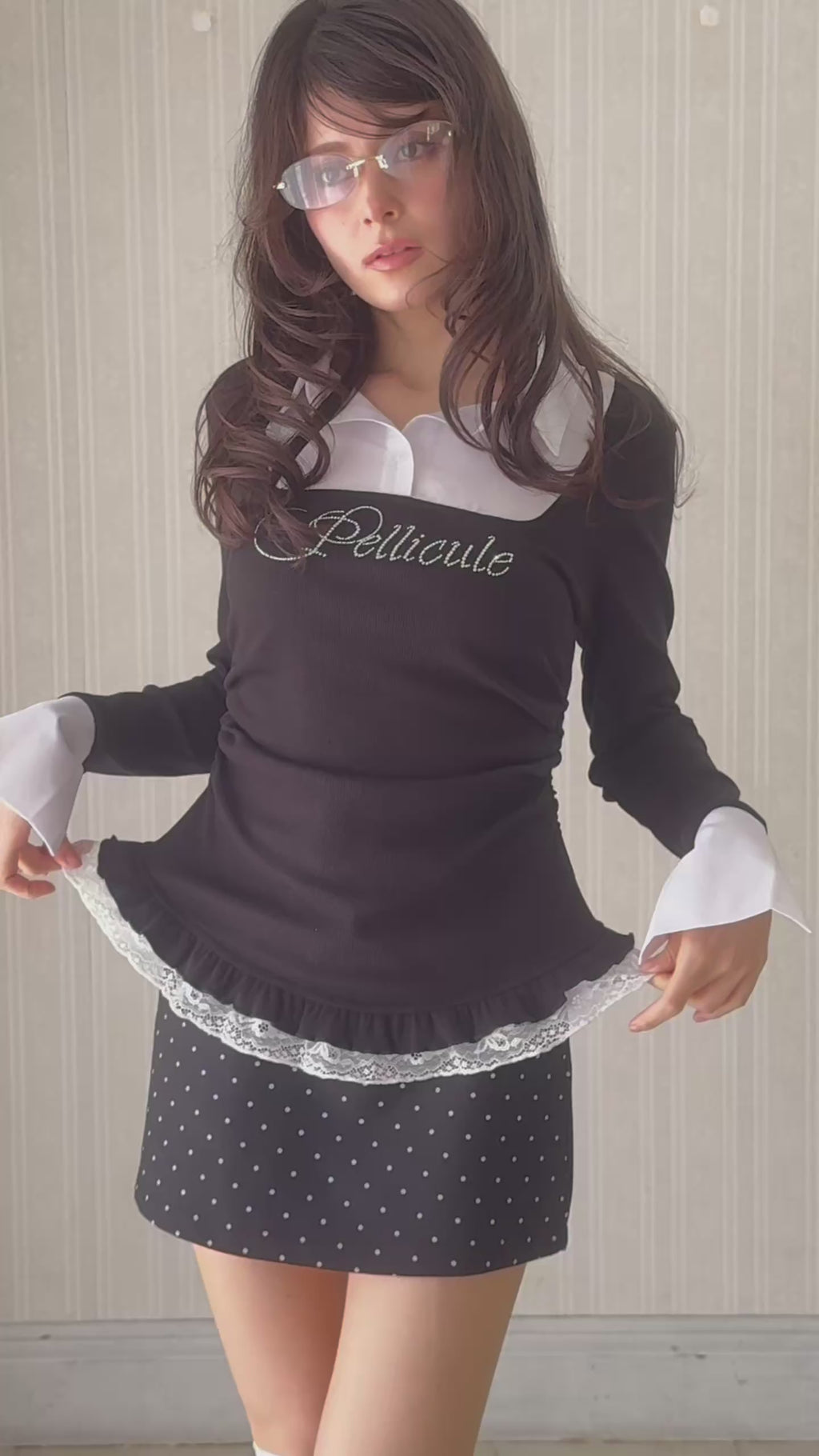 トップスは裾のカーブィなカッティングやサイドのギャザーデザインでPELLICULEらしいシルエットが魅力です。動くたびにきらめくフロントのラインストーンロゴも目を惹くポイント。スカートは華奢なドット柄のミニマルなデザイン。インナーパンツ付きです。
